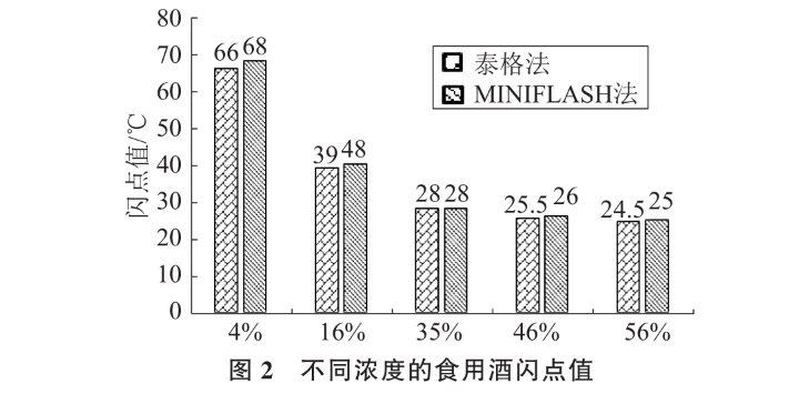 采用無水乙醇與蒸餾水配制了體積分數(shù)為 5%~73%乙醇溶液,分別采用泰格法和 MINIFLASH 法測定其閃點。每個試樣重復測定兩次,兩次結果偏差在 1 ℃內(nèi),取平均值為最終結果,實驗結果如圖 1 所示。乙醇體積分數(shù)低于 30%時,MINIFLASH 法測定值略高于泰格法,當乙醇濃度高于 30%時,兩種方法的測定值基本一致。將部分實驗結果與文獻值比較,誤差均在 2 ℃以內(nèi),說明泰格法和 MINIFLASH 法均適用于低閃點液體。對食用酒的閃點測定結果。泰格法與MINIFLASH 法的測定值較接近,二者誤差在 2 ℃ 以內(nèi)。隨著食用酒中乙醇體積濃度的降低,食用酒閃點值下降。與圖 1 對比可以發(fā)現(xiàn),體積分數(shù)相同的食用酒與乙醇溶液的閃點值基本一致,說明泰格法與 MINIFLASH 法對含乙醇類混合液體的閃點測定非常適用。